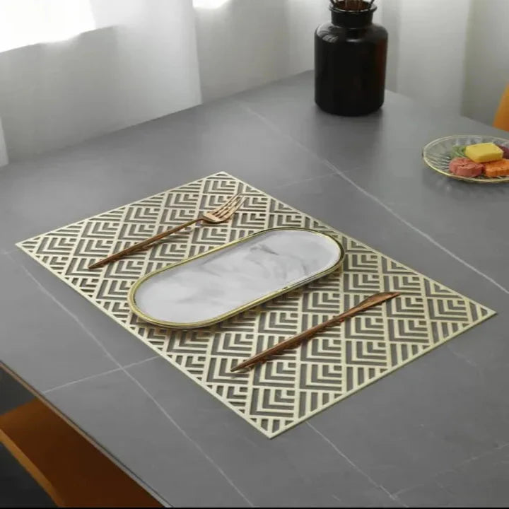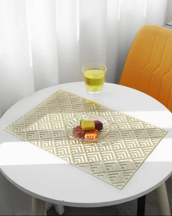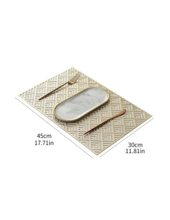 size 12x18 inch Made of high quality vinyl material, owning high strength and strong durability, hard to wear out and deform, long service life. Good heat insulation Thickened material, good insulated function, can effectively prevent hot pots damaging the table. Metallic color, through process, metallic color, simple and elegant, can also be used for decorating home, wedding scene, etc. Washable Can be easily cleaned with water, convenient for next time use, cost saving. Specifications: Item type: Insulated Placemat Material: Vinyl