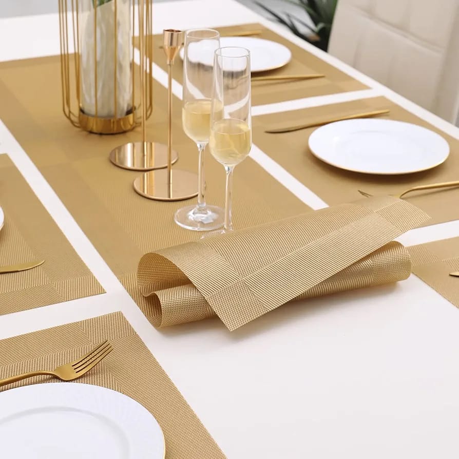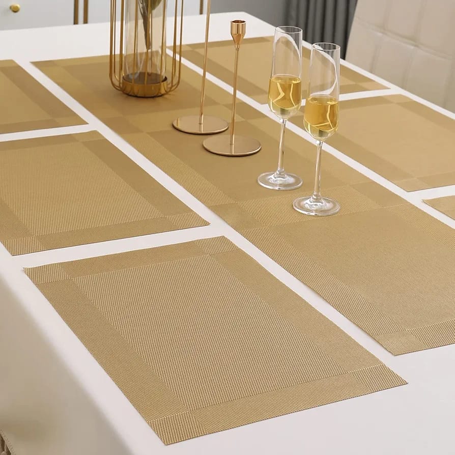 7Pcs Table Mat & Table Runner Dark Golden Color Set Heat Resistant Placemats, Stain Resistant Washable PVC Table Mats for Dining Table Woven Placemat