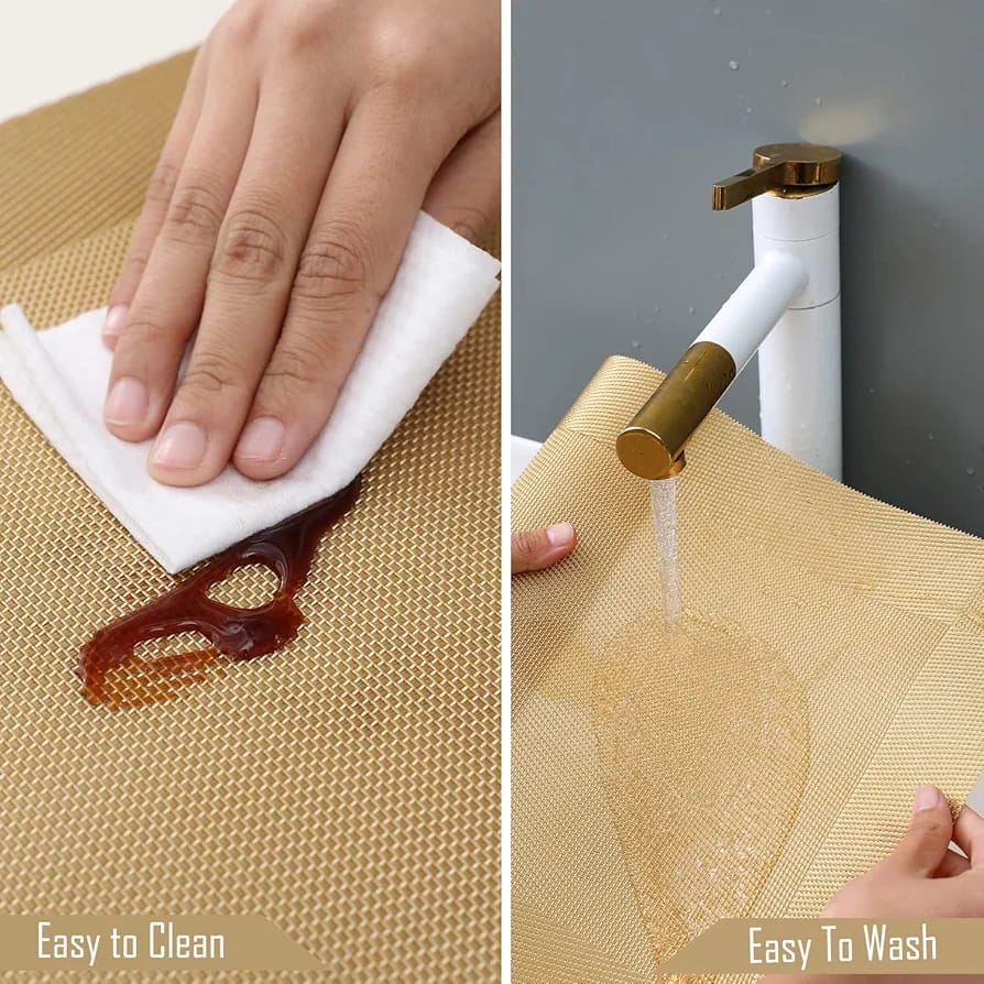 - Washable,Non-fading,Non-stain,Not mildew,Wipe Clean.Anti-skid.Don't put tomato juice on the placemats. It's hard to clean up.Temperature should not exceed 100℃