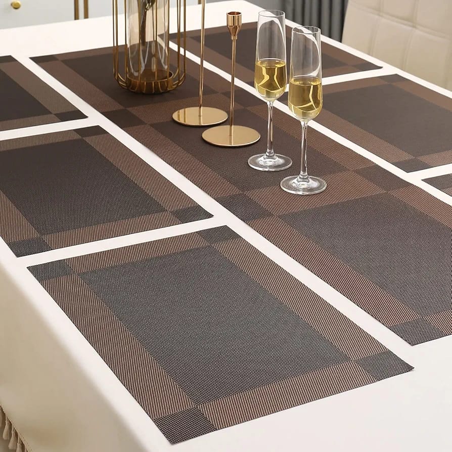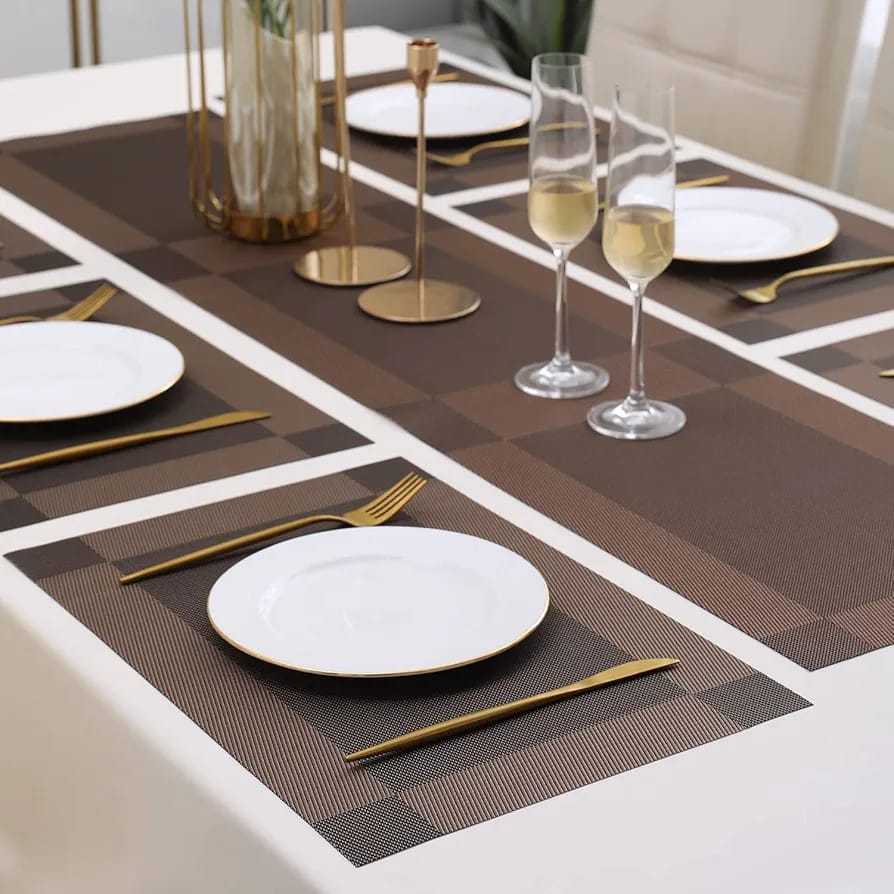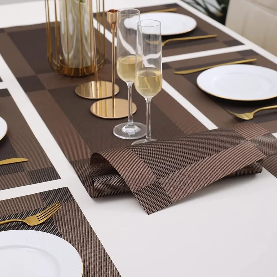 7Pcs Table Mat & Table Runner Dark Brown Color Set Heat Resistant Placemats, Stain Resistant Washable PVC Table Mats for Dining Table Woven Placemat