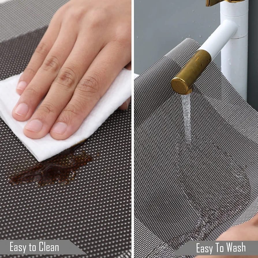 - Washable,Non-fading,Non-stain,Not mildew,Wipe Clean.Anti-skid.Don't put tomato juice on the placemats. It's hard to clean up.Temperature should not exceed 100℃
