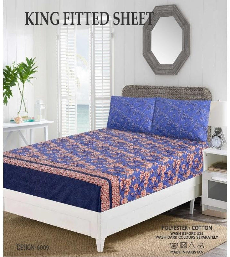 Upgrade your bedding with this king-size fitted sheet set made from a soft polyester/cotton blend. The fitted sheet measures 72 x 78 + 10 inches, ensuring a snug fit for your mattress, while the set includes two matching pillowcases (19 x 29 inches). For best results, wash before use and launder dark colors separately. Made in Pakistan.